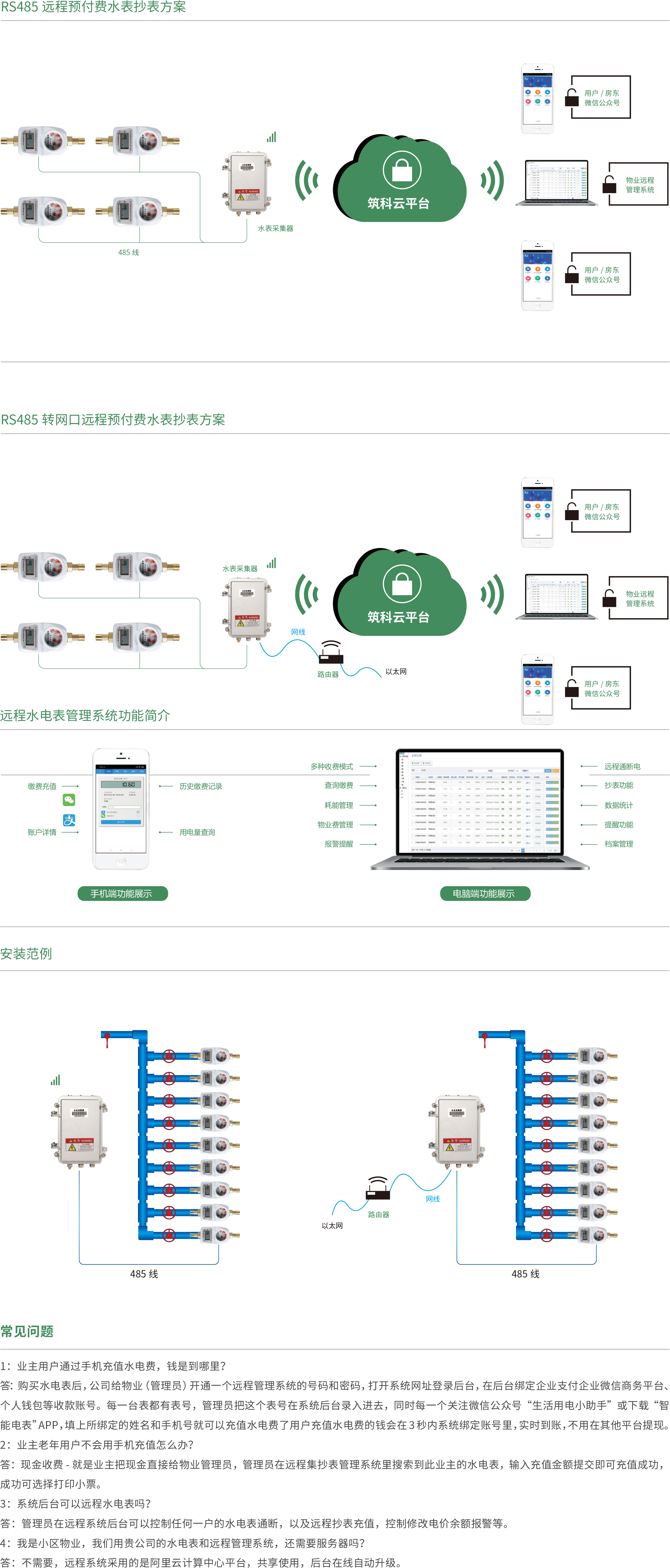 本方案适合水表集中安装的方式,例如—层楼的水井内安装40台水表,用—根0.5平方的双绞线将40台水表485接线端子并联起来,然后接到水表采集器上,水表采集器通过GPRS网络或以太网的方式连接到系统云服务器,打开系统云平台网址登录后,将采集器和水表的通讯号录入在系统后台即可管理水表设备。