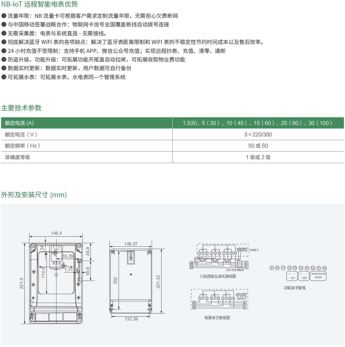 NB-IoT物联网DTSY1902型远程三相四线预付费电表是我司自主研制的一款用于远程抄表及通断电的智能电表,它通过窄带物联网( Narrow Band Internet of Things, NB-IoT)与服务器进行远程通讯,无需使用采集器或集中嚣设备,简化了设备安装工作,实现了对电表使用量的自动远程抄表,并有效的避免了管理部门上门抄表的人力工作,该电表具备通断电控制功能,可方便管理部门对电表的用电情况进行控制,使得远程抄表及控制变的便挺、可靠,在节约人力、物力和财力的同时,有效提高了生产效益。
